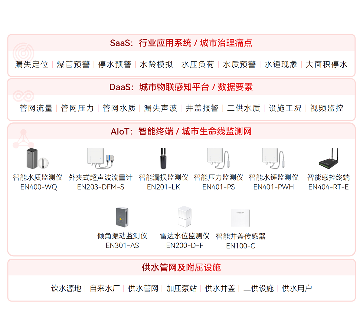 對供水管網(wǎng)設(shè)施及水質(zhì)提供實時監(jiān)測,通過各類智能監(jiān)測終端保障供水壓力平衡、流量穩(wěn)定和供水安全,及時發(fā)現(xiàn)爆管并預(yù)警,避免大面積城市停水事故發(fā)生,為管網(wǎng)爆管預(yù)警分析、用水趨勢分析和泄漏量預(yù)警分析提供數(shù)據(jù)支撐。