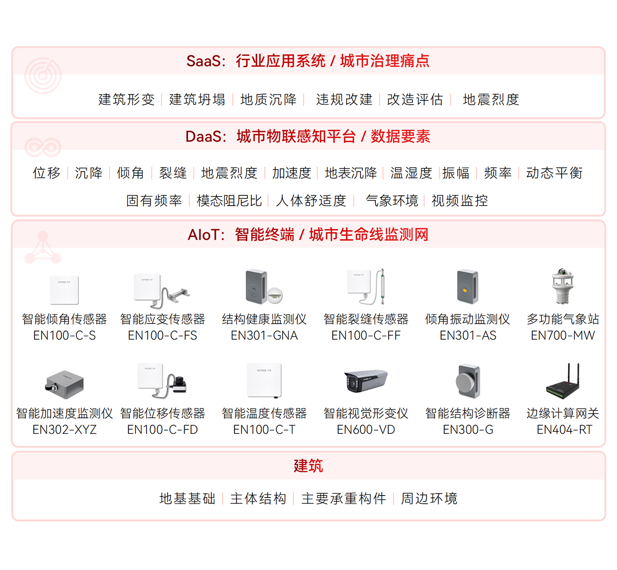 實時監(jiān)控建筑結(jié)構(gòu)健康狀態(tài),通過位移、沉降、傾斜、溫濕度、裂縫和動態(tài)平衡、自振頻率的數(shù)據(jù)收集分析,對潛在災(zāi)害進行提前預(yù)警,對突發(fā)事件應(yīng)急報警,為結(jié)構(gòu)坍塌監(jiān)測預(yù)警分析和滑坡監(jiān)測預(yù)警分析提供數(shù)據(jù)支撐,實現(xiàn)對建筑健康狀態(tài)的實時評估。